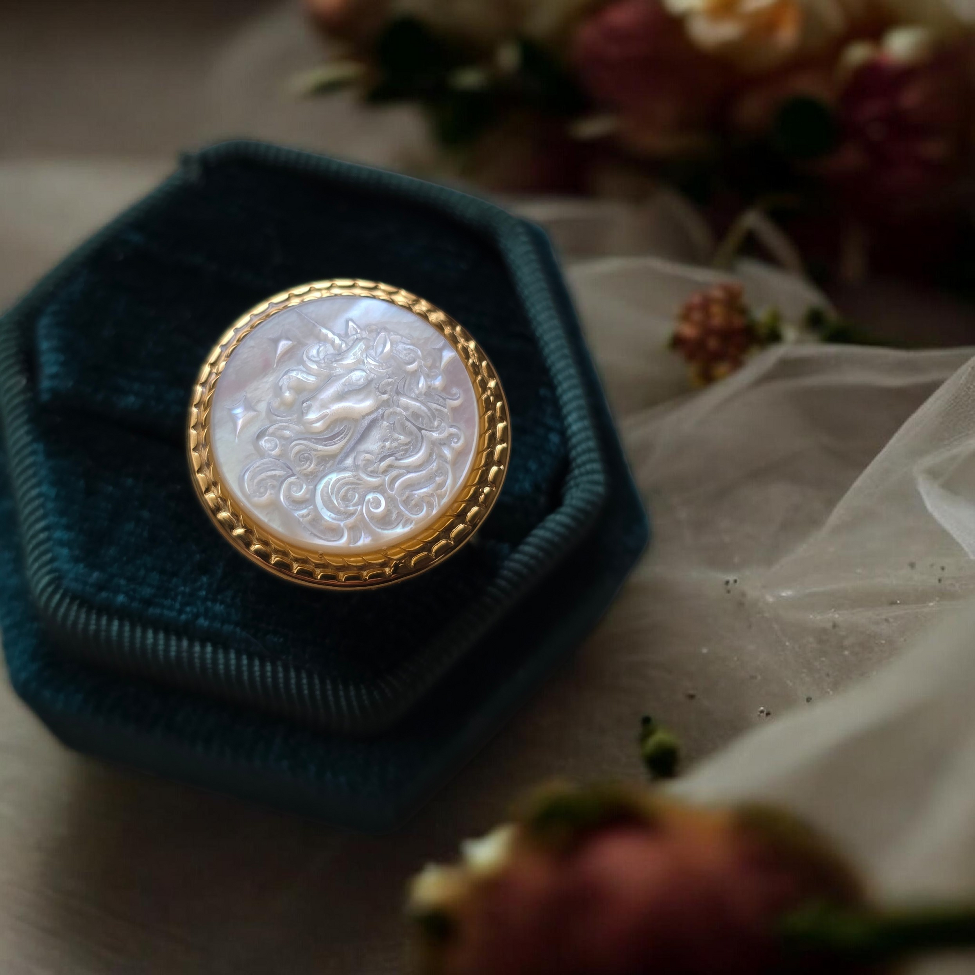 Un unicorno inciso nella madreperla bianca, simbolo di purezza, visione e forza silenziosa.