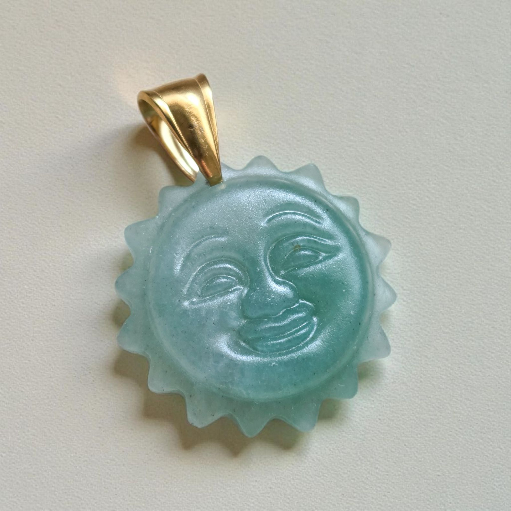 Un sole in avventurina verde, scolpito con un sorriso dolce che porta subito calma.