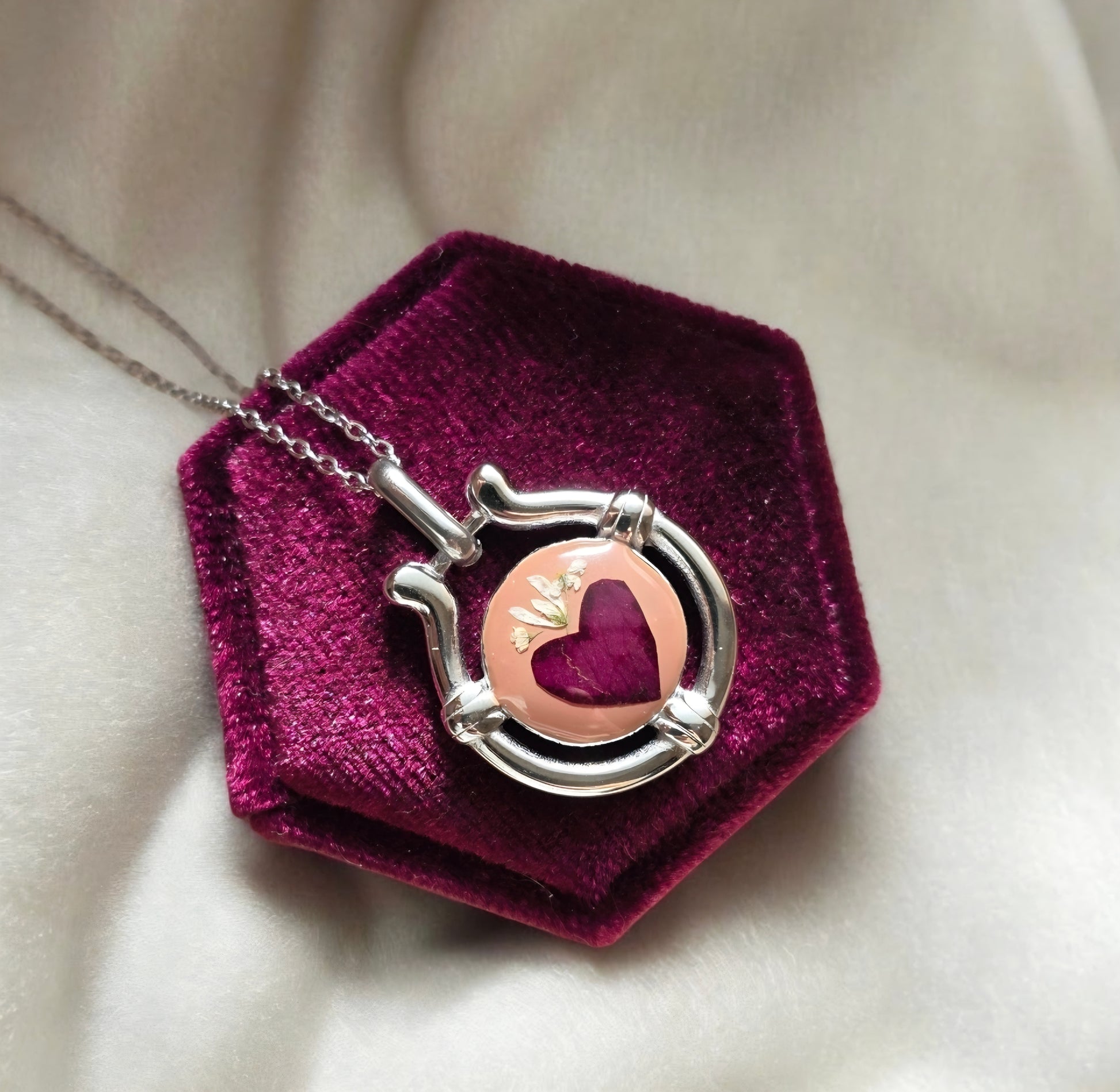 Una collana che racchiude simbolo e poesia: un cuore che custodisce fiori veri, protetto da una cornice che richiama la forma di un’arpa, segno di armonia e protezione.