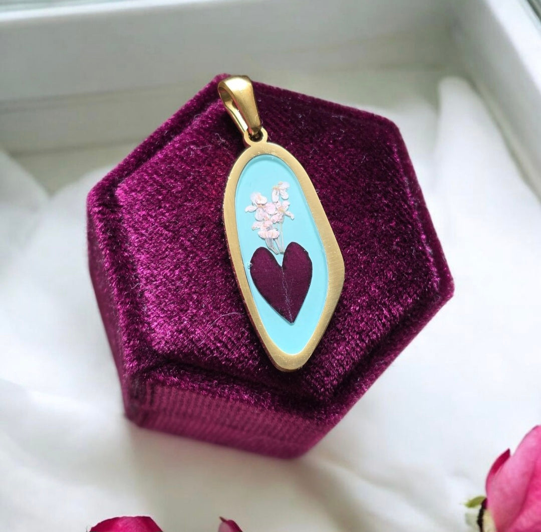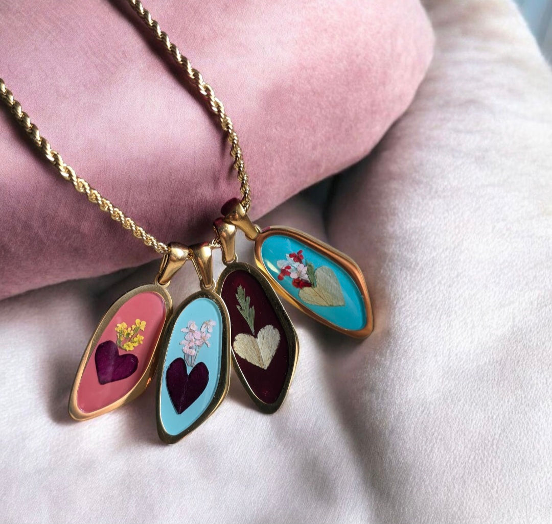Ogni ciondolo custodisce veri petali essiccati, racchiusi in resina e incorniciati in acciaio inox 316L placcato oro 18kt. Nessun pezzo è identico a un altro: ogni cuore racchiude un fiore diverso, e ogni fiore racconta una storia irripetibile.