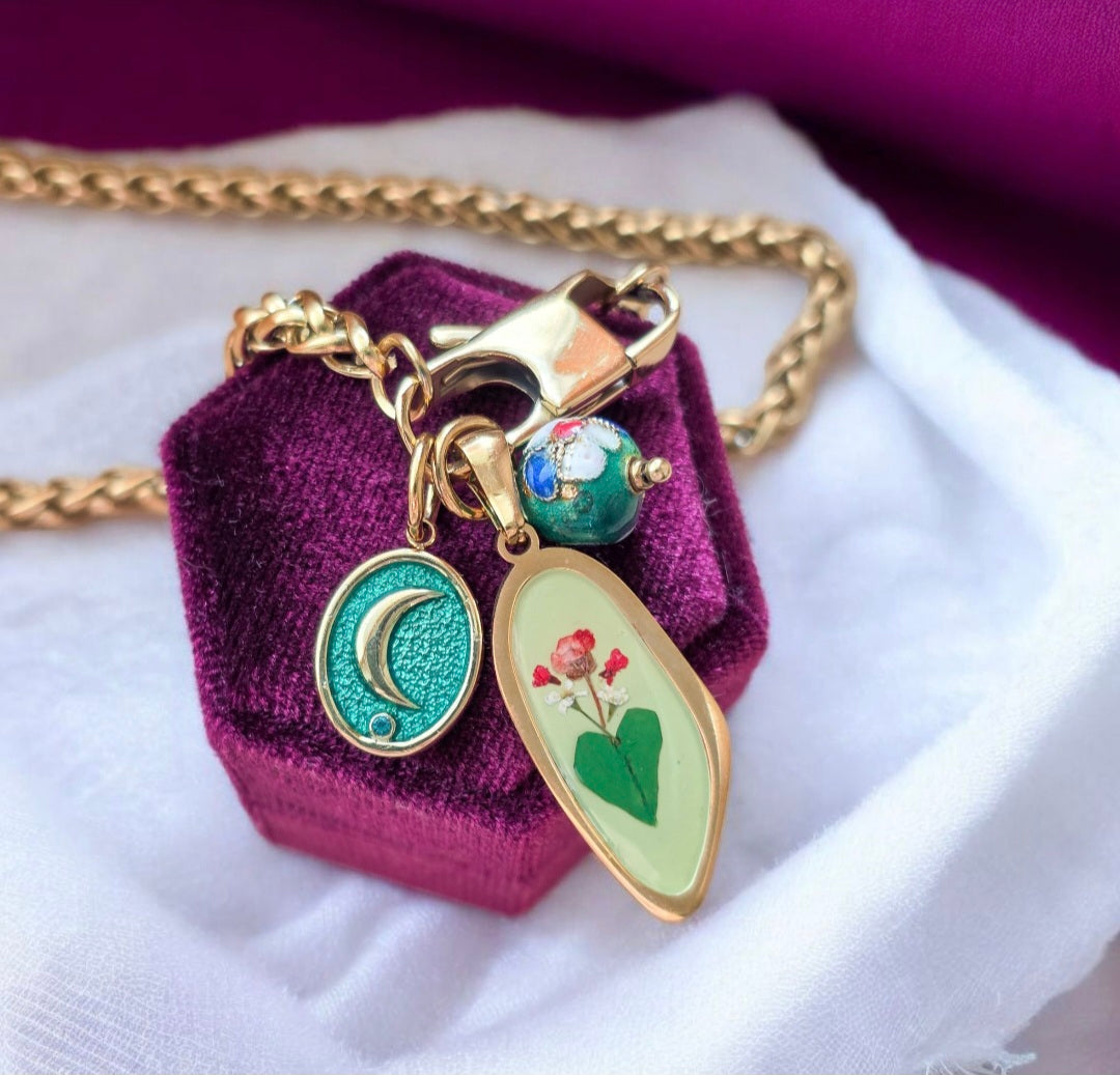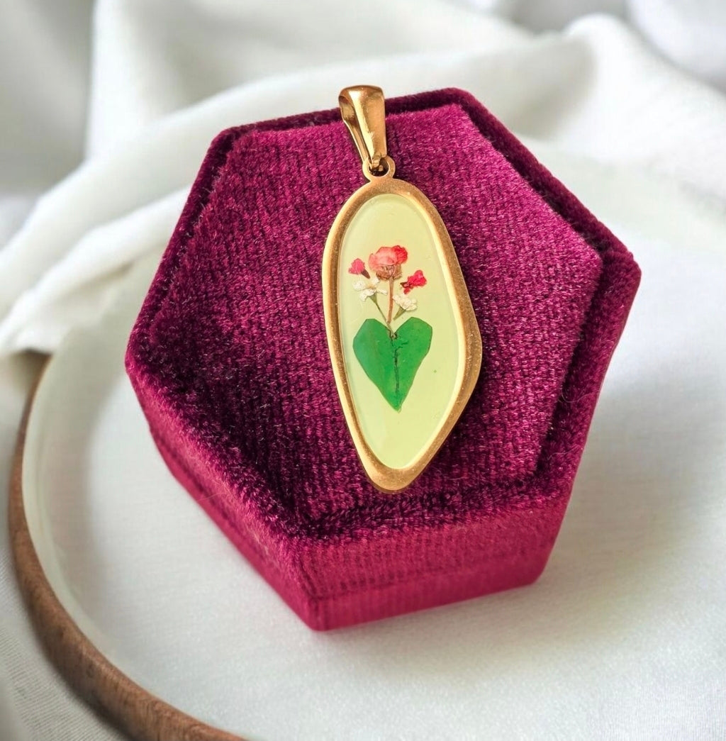 Ogni ciondolo custodisce veri petali essiccati, racchiusi in resina e incorniciati in acciaio inox 316L placcato oro 18kt. Nessun pezzo è identico a un altro: ogni cuore racchiude un fiore diverso, e ogni fiore racconta una storia irripetibile.