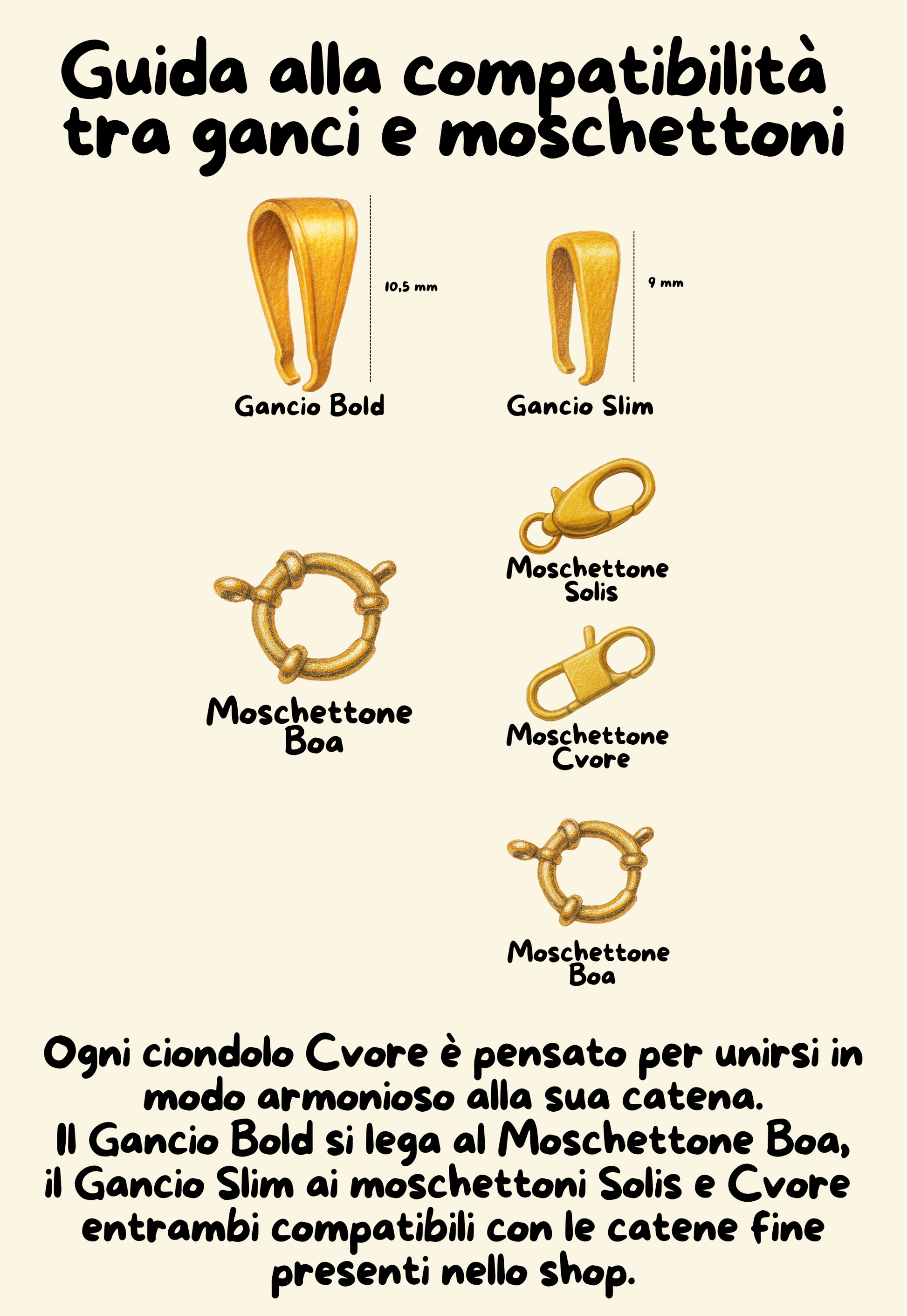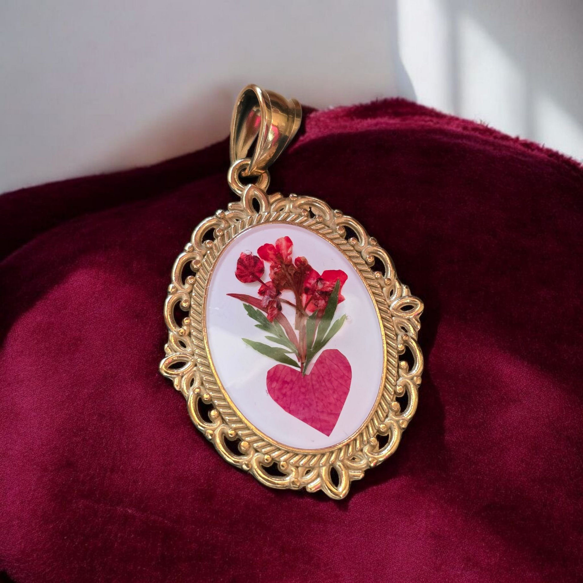Ogni ciondolo custodisce veri petali essiccati, racchiusi in resina e incorniciati in acciaio inox 316L placcato oro 18kt. Nessun pezzo è identico a un altro: ogni cuore racchiude un fiore diverso, e ogni fiore racconta una storia irripetibile.