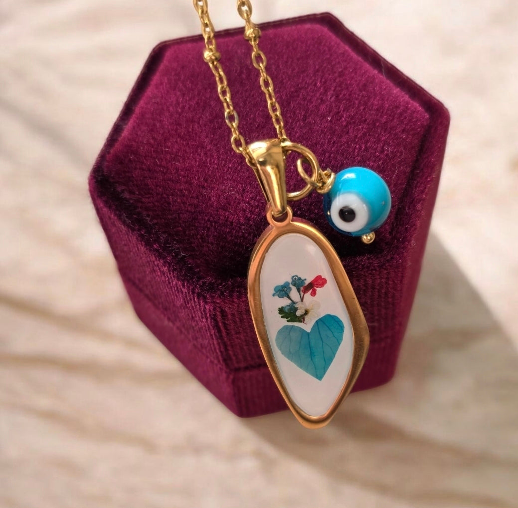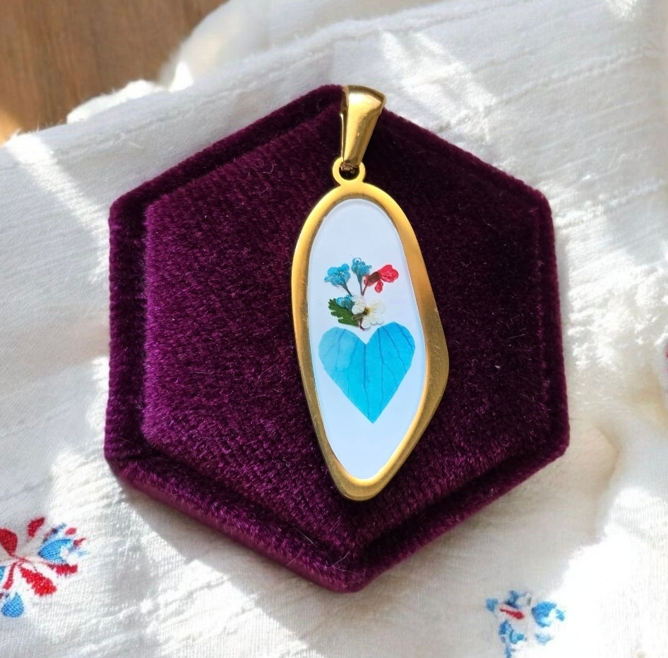 Ogni ciondolo custodisce veri petali essiccati, racchiusi in resina e incorniciati in acciaio inox 316L placcato oro 18kt. Nessun pezzo è identico a un altro: ogni cuore racchiude un fiore diverso, e ogni fiore racconta una storia irripetibile.