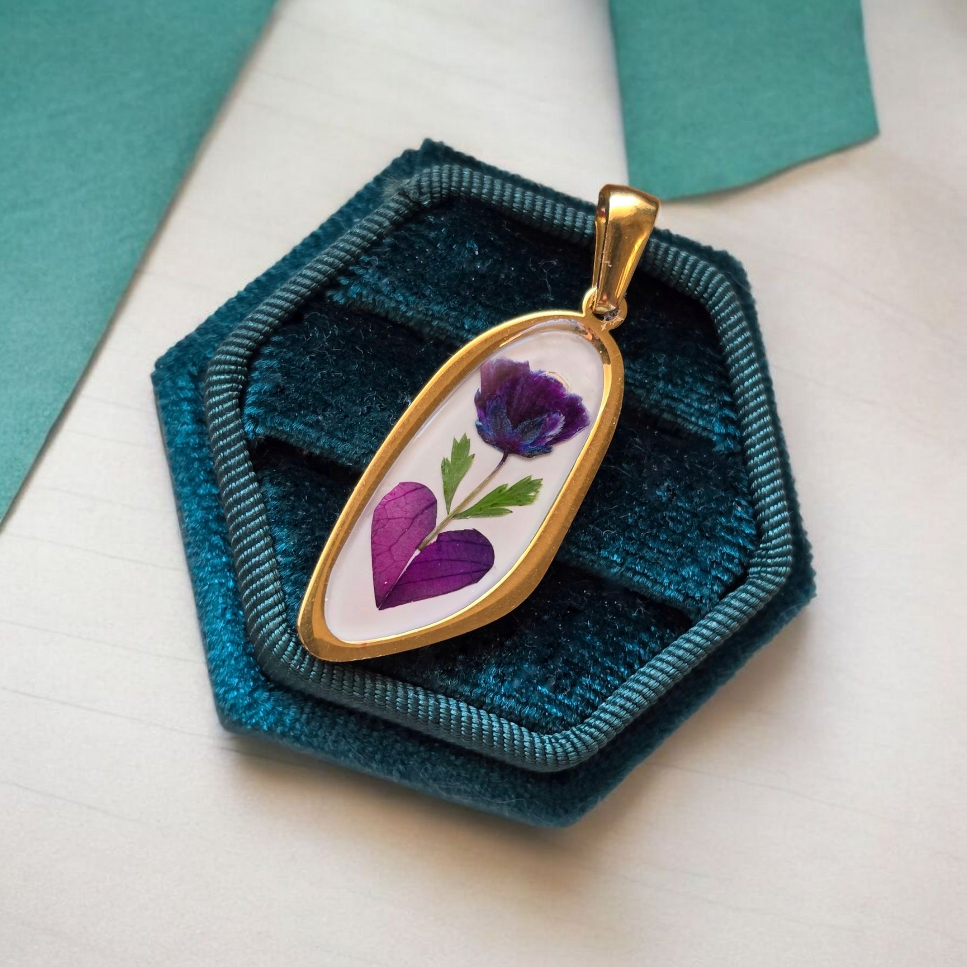 Ogni ciondolo custodisce veri petali essiccati, racchiusi in resina e incorniciati in acciaio inox 316L placcato oro 18kt. Nessun pezzo è identico a un altro: ogni cuore racchiude un fiore diverso, e ogni fiore racconta una storia irripetibile.
