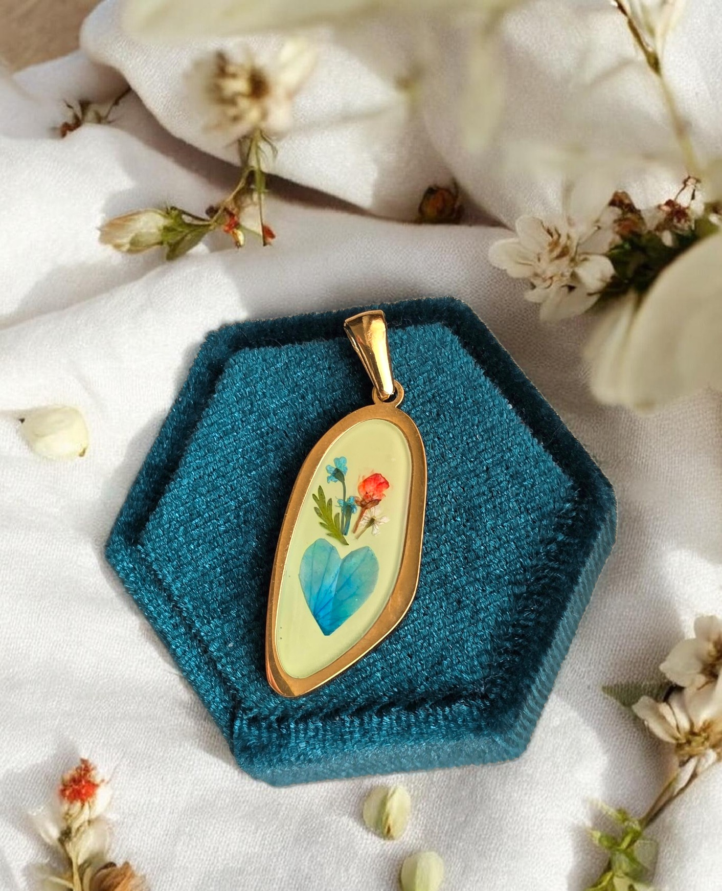 Ogni ciondolo custodisce veri petali essiccati, racchiusi in resina e incorniciati in acciaio inox 316L placcato oro 18kt. Nessun pezzo è identico a un altro: ogni cuore racchiude un fiore diverso, e ogni fiore racconta una storia irripetibile.