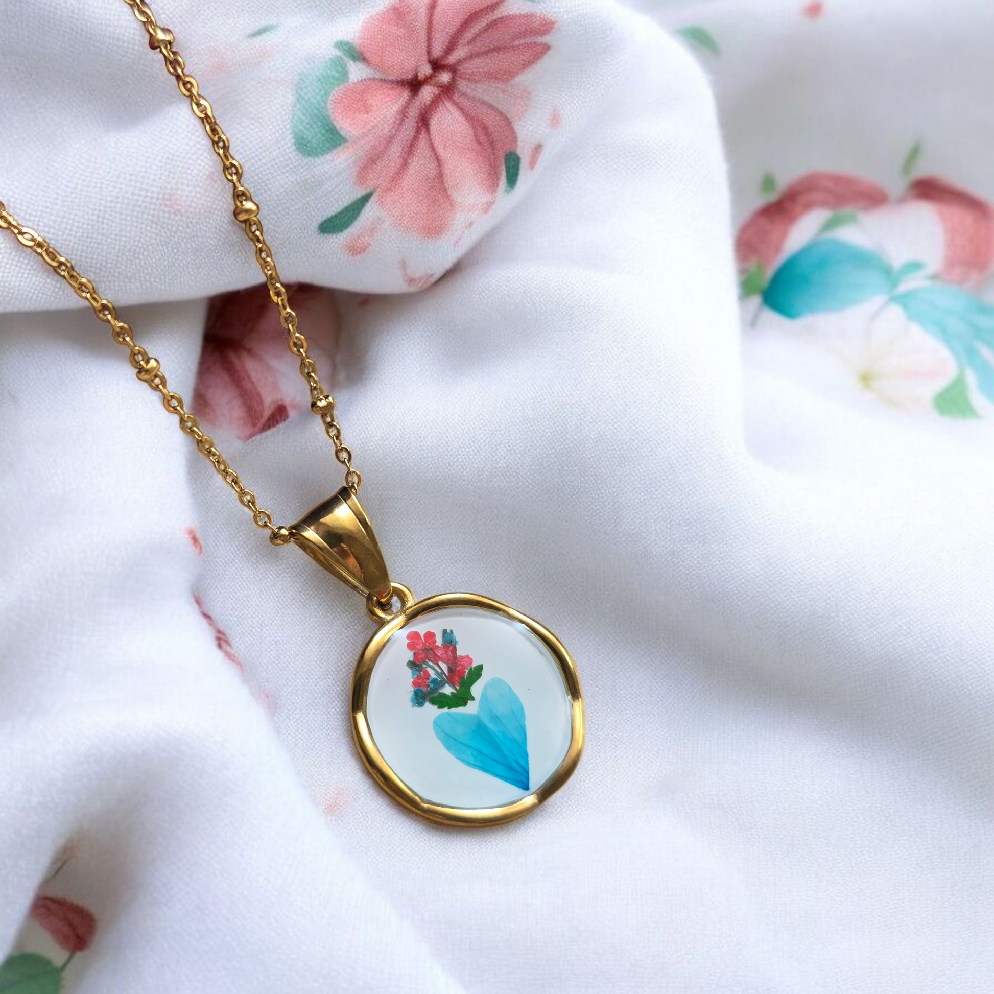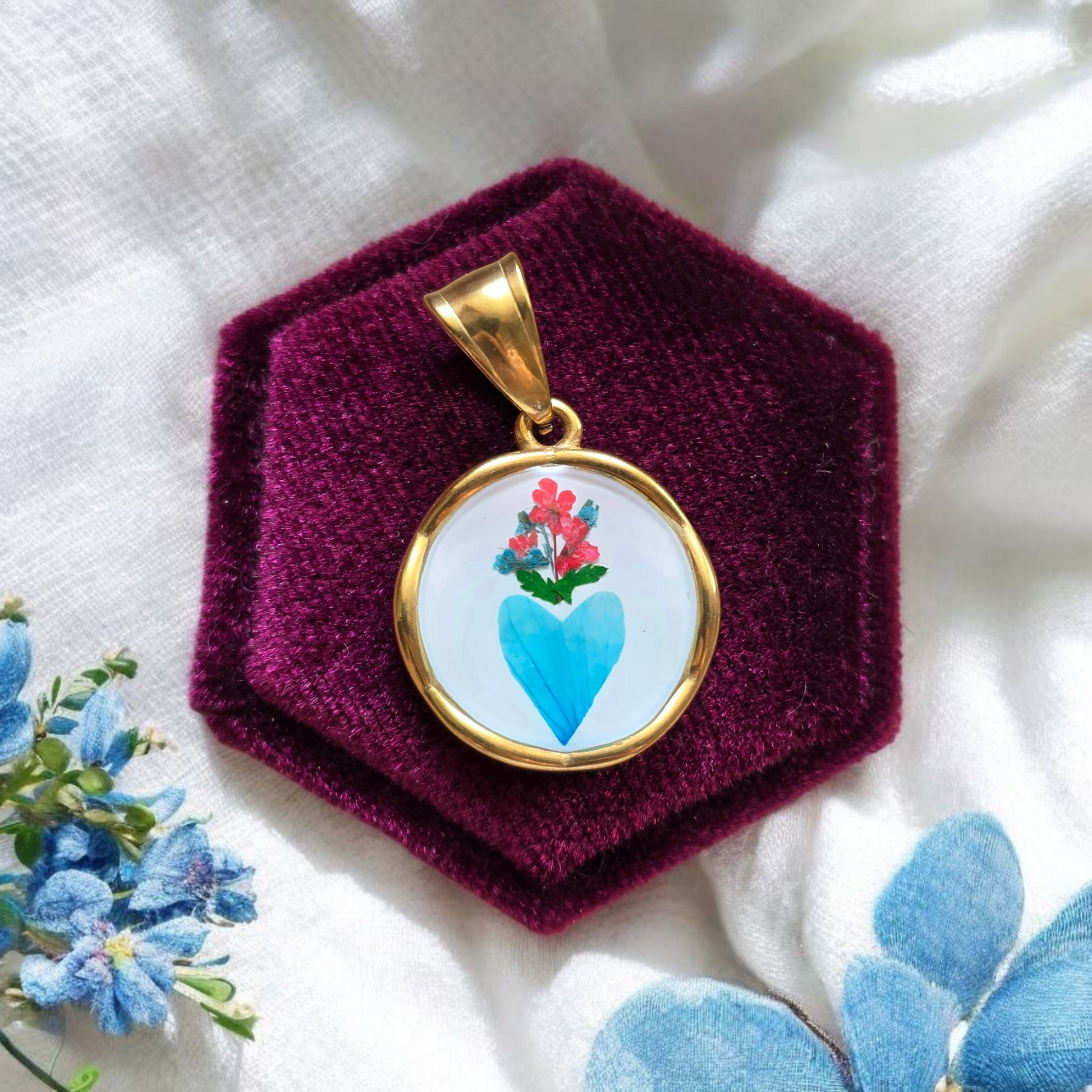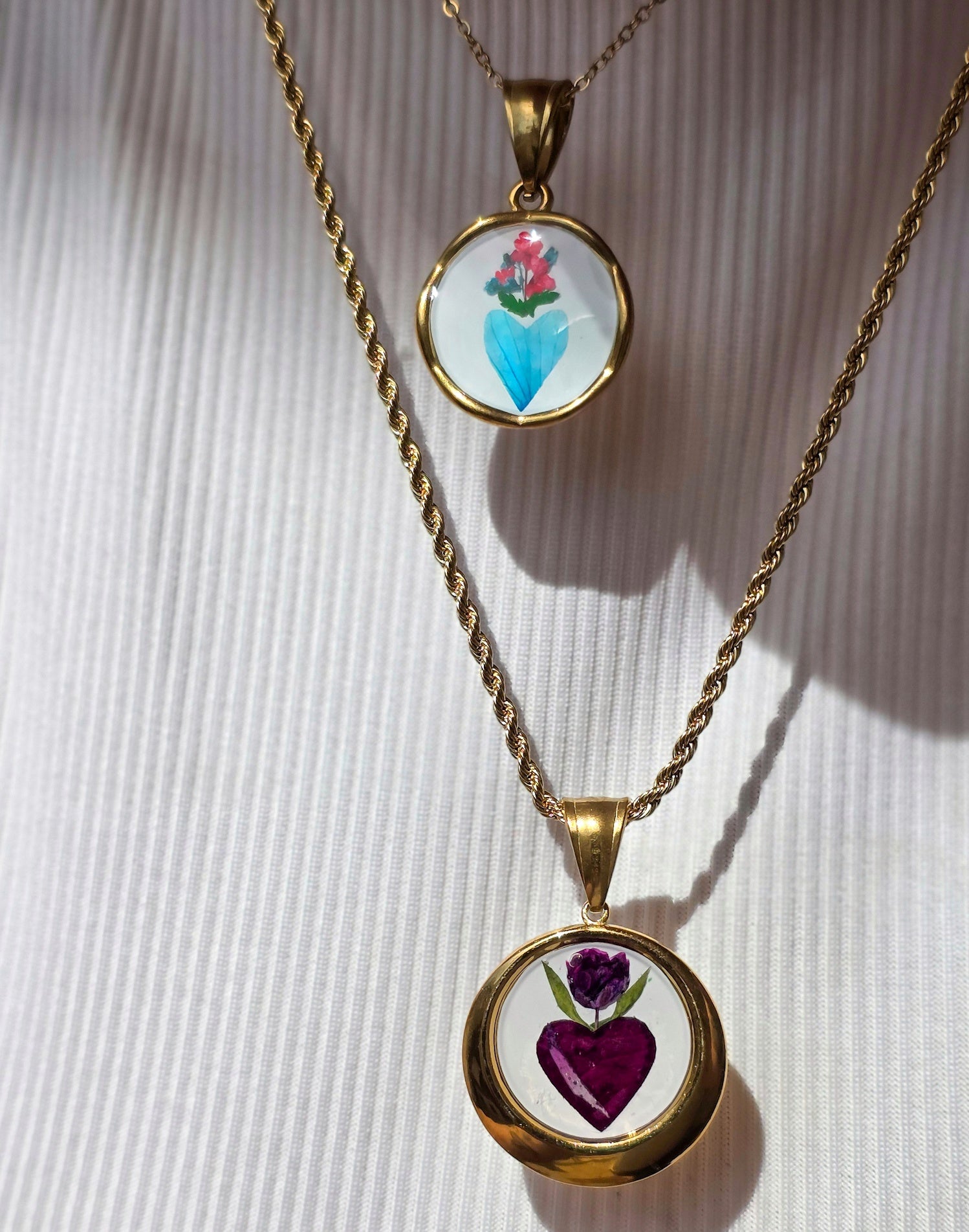 Ogni ciondolo custodisce veri petali essiccati, racchiusi in resina e incorniciati in acciaio inox 316L placcato oro 18kt. Nessun pezzo è identico a un altro: ogni cuore racchiude un fiore diverso, e ogni fiore racconta una storia irripetibile.