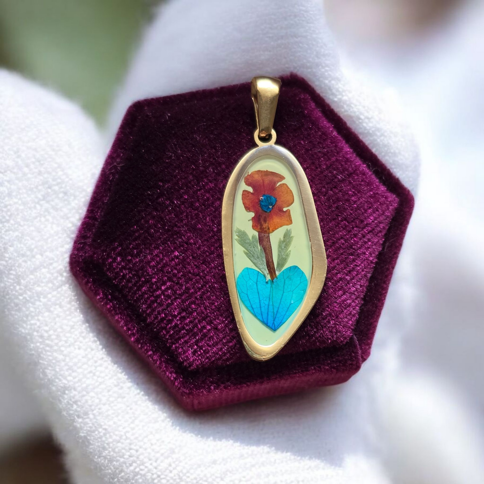 Ogni ciondolo custodisce veri petali essiccati, racchiusi in resina e incorniciati in acciaio inox 316L placcato oro 18kt. Nessun pezzo è identico a un altro: ogni cuore racchiude un fiore diverso, e ogni fiore racconta una storia irripetibile.