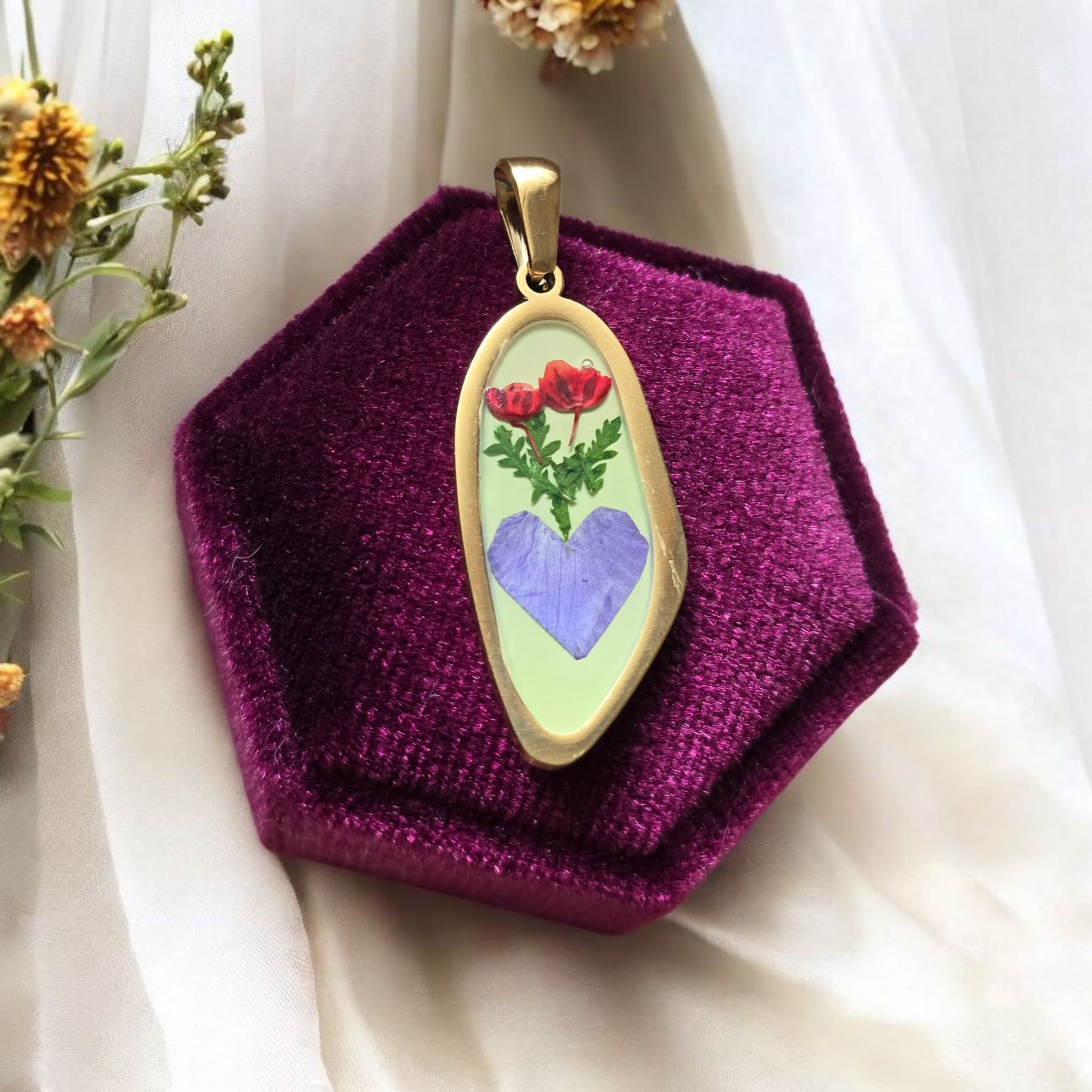 Ogni ciondolo custodisce veri petali essiccati, racchiusi in resina e incorniciati in acciaio inox 316L placcato oro 18kt. Nessun pezzo è identico a un altro: ogni cuore racchiude un fiore diverso, e ogni fiore racconta una storia irripetibile.