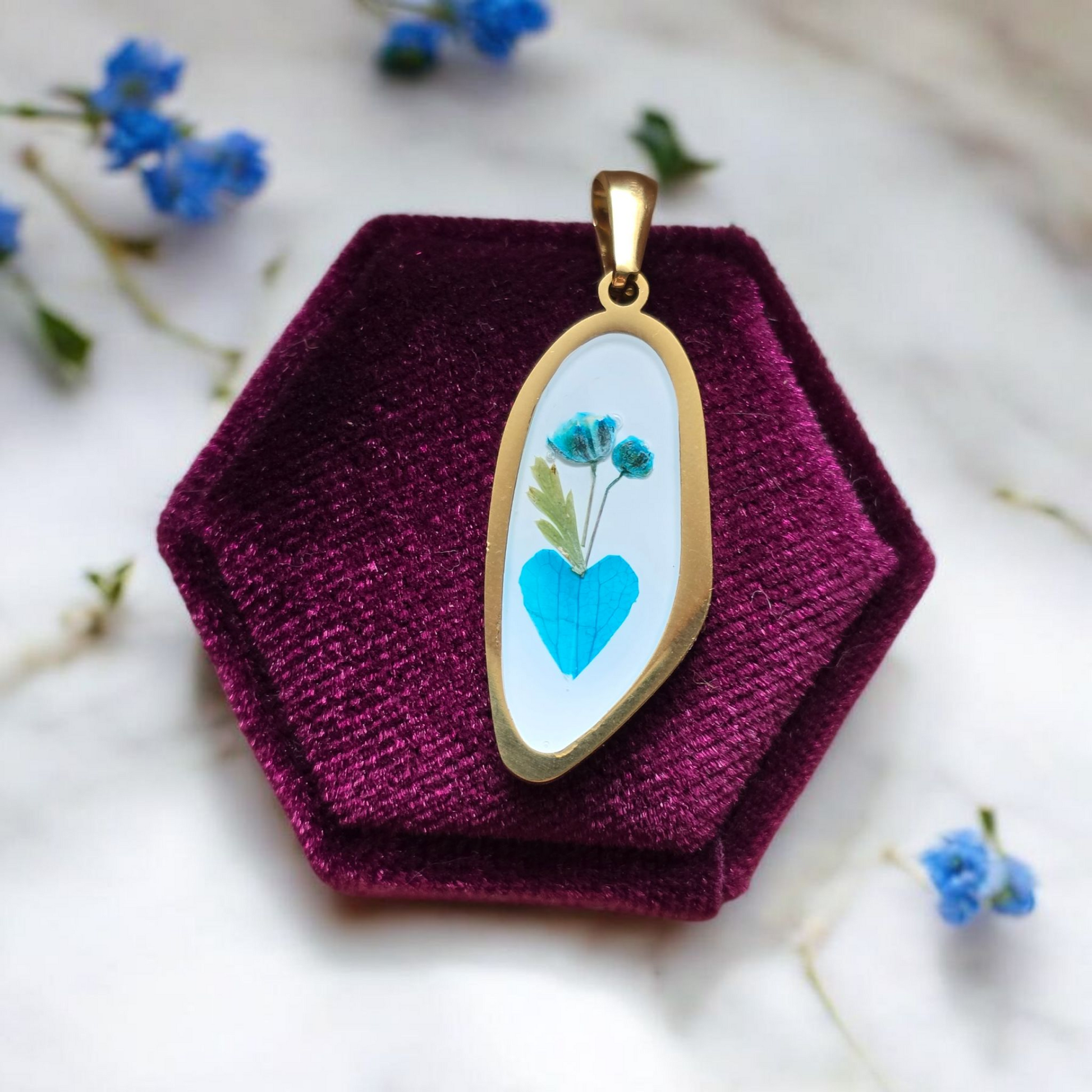 Ogni ciondolo custodisce veri petali essiccati, racchiusi in resina e incorniciati in acciaio inox 316L placcato oro 18kt. Nessun pezzo è identico a un altro: ogni cuore racchiude un fiore diverso, e ogni fiore racconta una storia irripetibile.