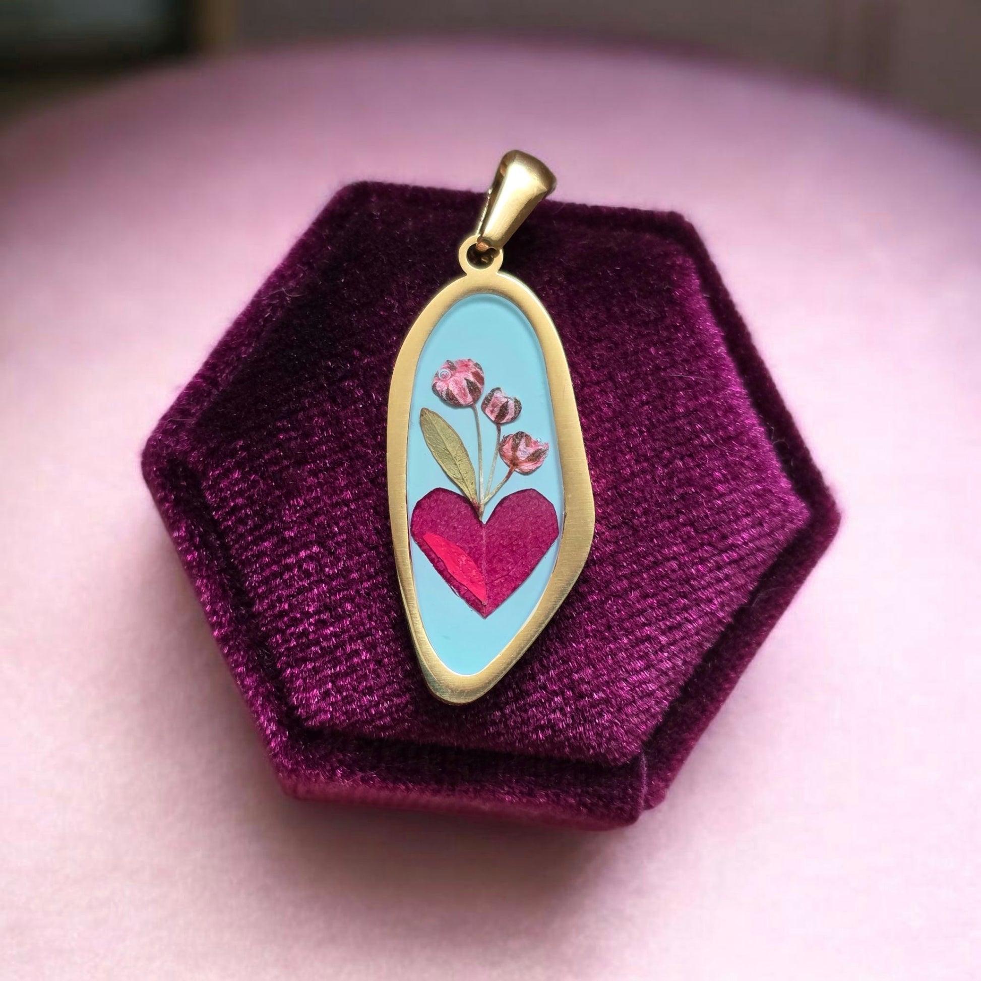 Ogni ciondolo custodisce veri petali essiccati, racchiusi in resina e incorniciati in acciaio inox 316L placcato oro 18kt. Nessun pezzo è identico a un altro: ogni cuore racchiude un fiore diverso, e ogni fiore racconta una storia irripetibile.