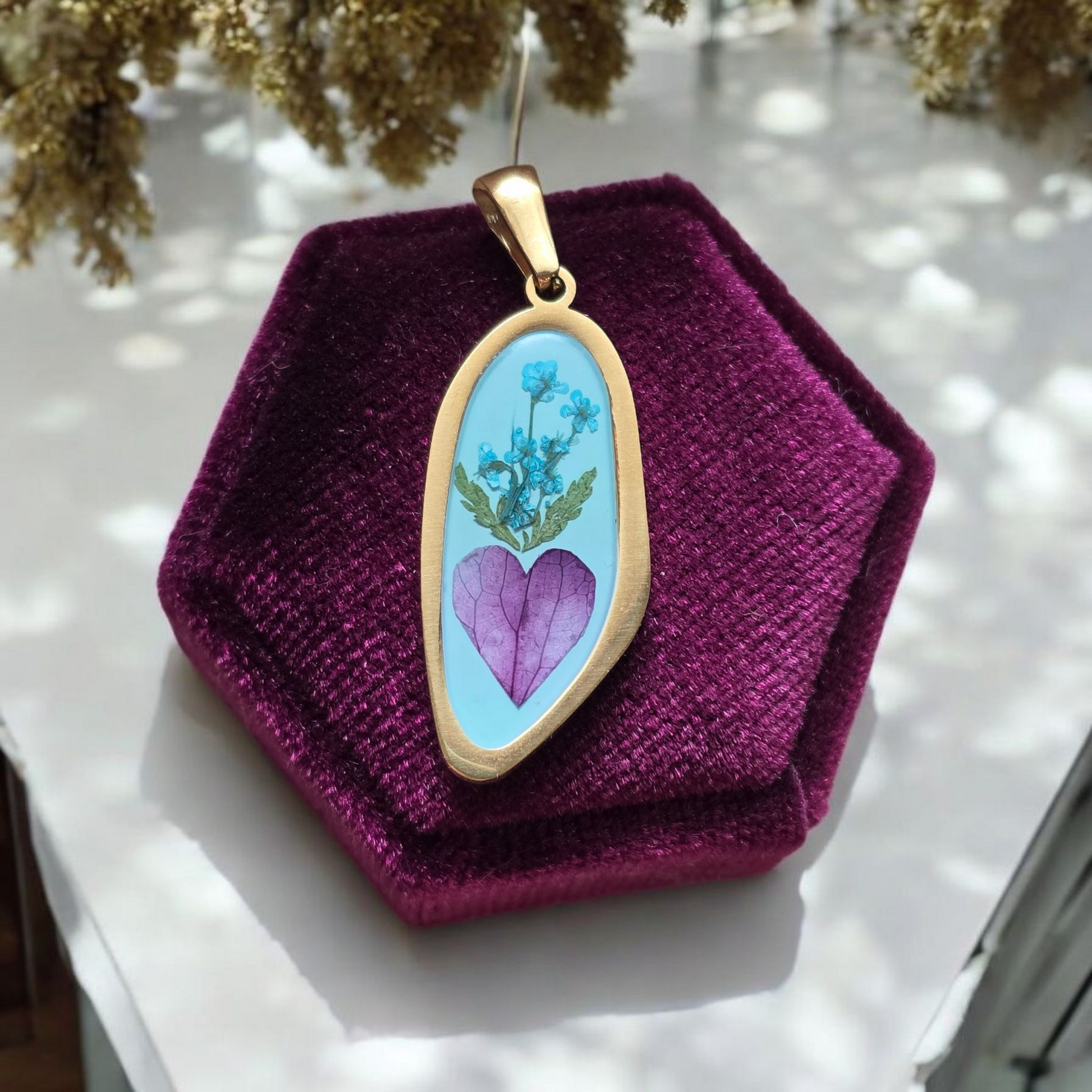 Ogni ciondolo custodisce veri petali essiccati, racchiusi in resina e incorniciati in acciaio inox 316L placcato oro 18kt. Nessun pezzo è identico a un altro: ogni cuore racchiude un fiore diverso, e ogni fiore racconta una storia irripetibile.