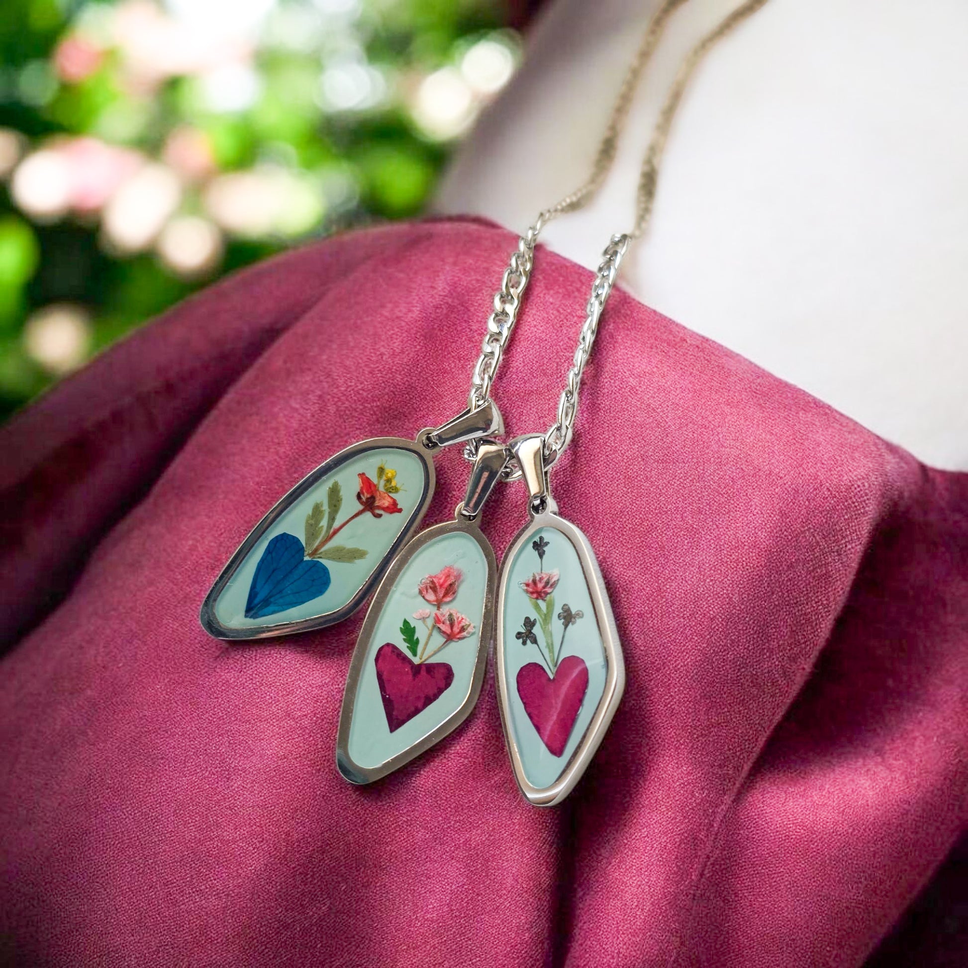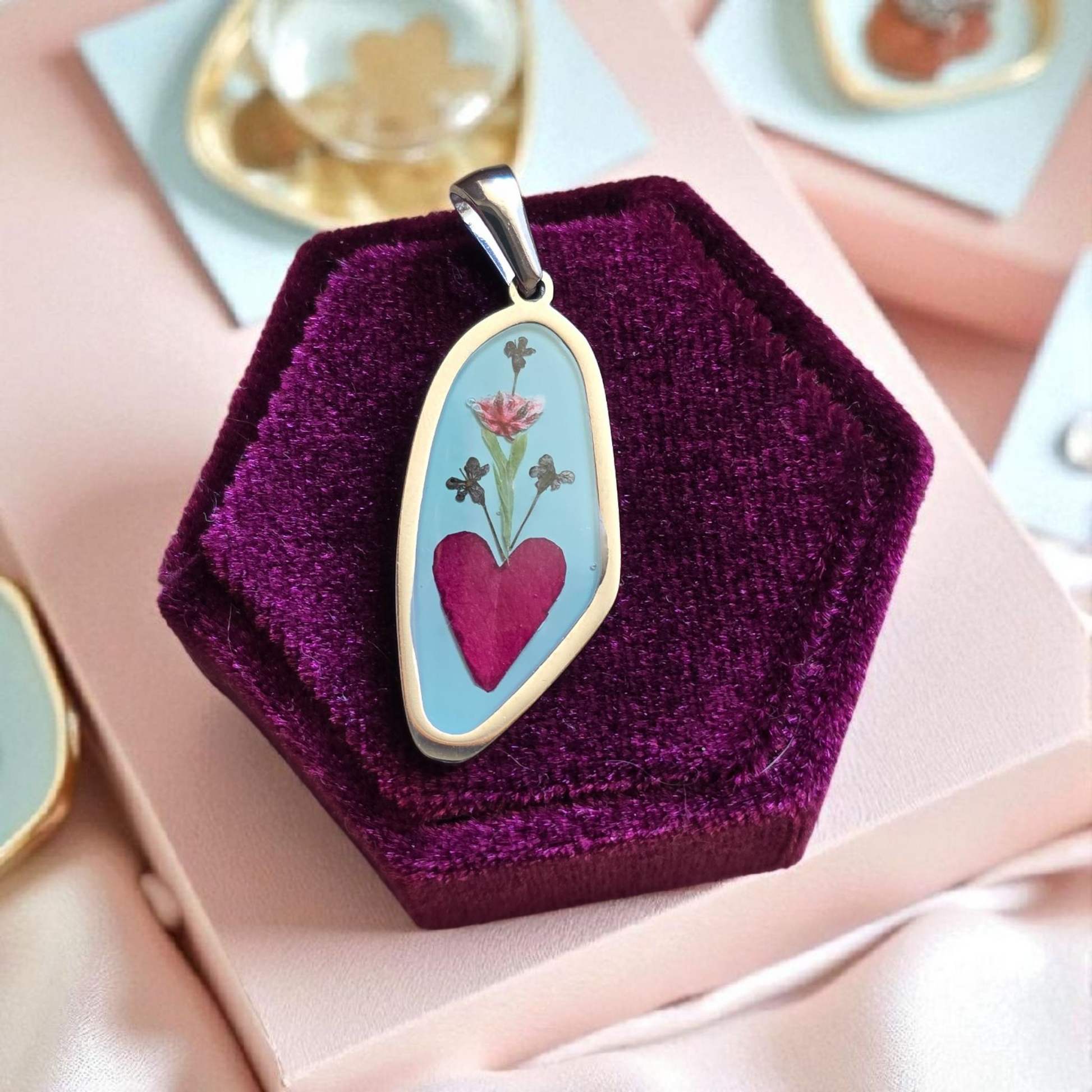 Ogni ciondolo custodisce veri petali essiccati, racchiusi in resina e incorniciati in acciaio inox 316L placcato oro 18kt. Nessun pezzo è identico a un altro: ogni cuore racchiude un fiore diverso, e ogni fiore racconta una storia irripetibile.