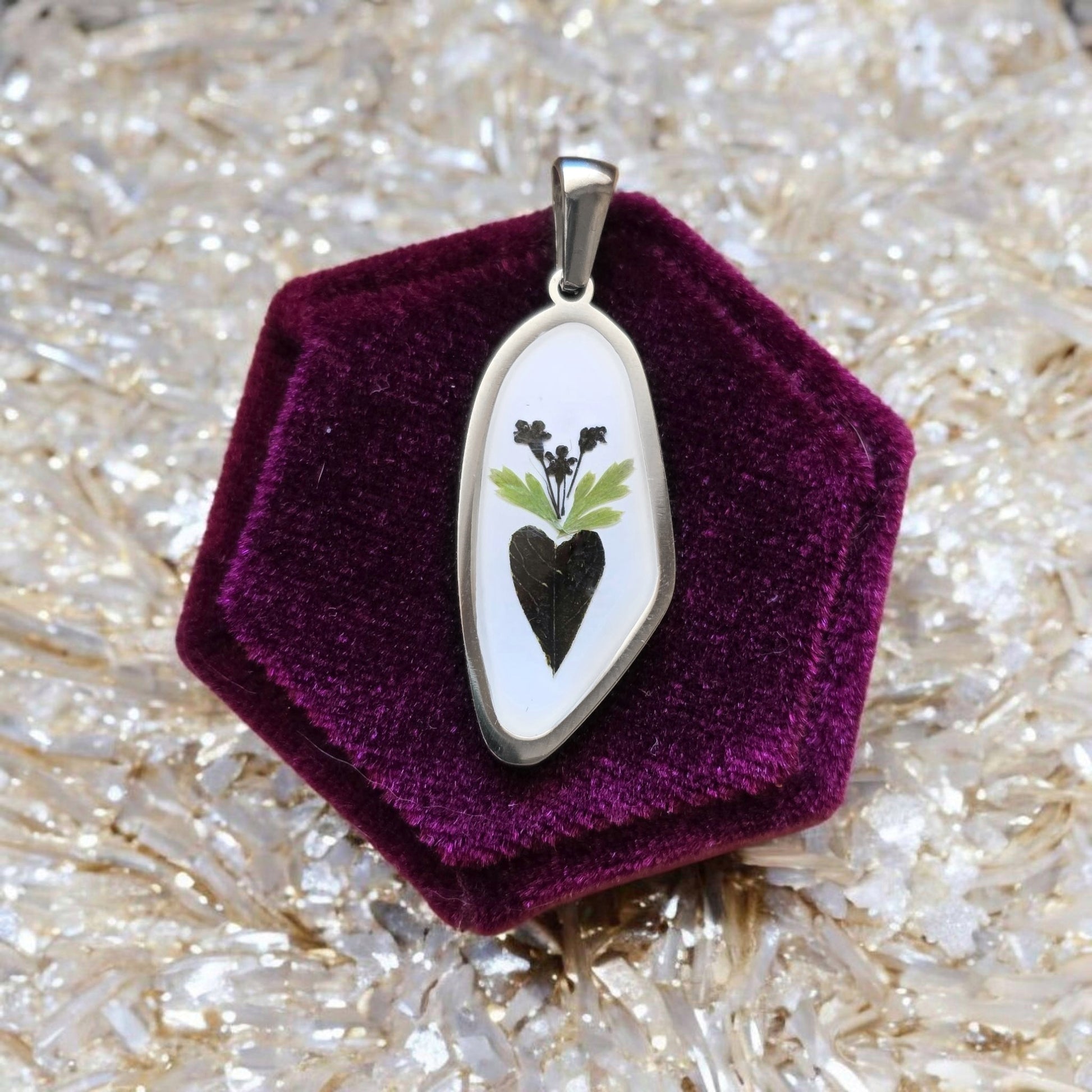 Ogni ciondolo custodisce veri petali essiccati, racchiusi in resina e incorniciati in acciaio inox 316L placcato oro 18kt. Nessun pezzo è identico a un altro: ogni cuore racchiude un fiore diverso, e ogni fiore racconta una storia irripetibile.
