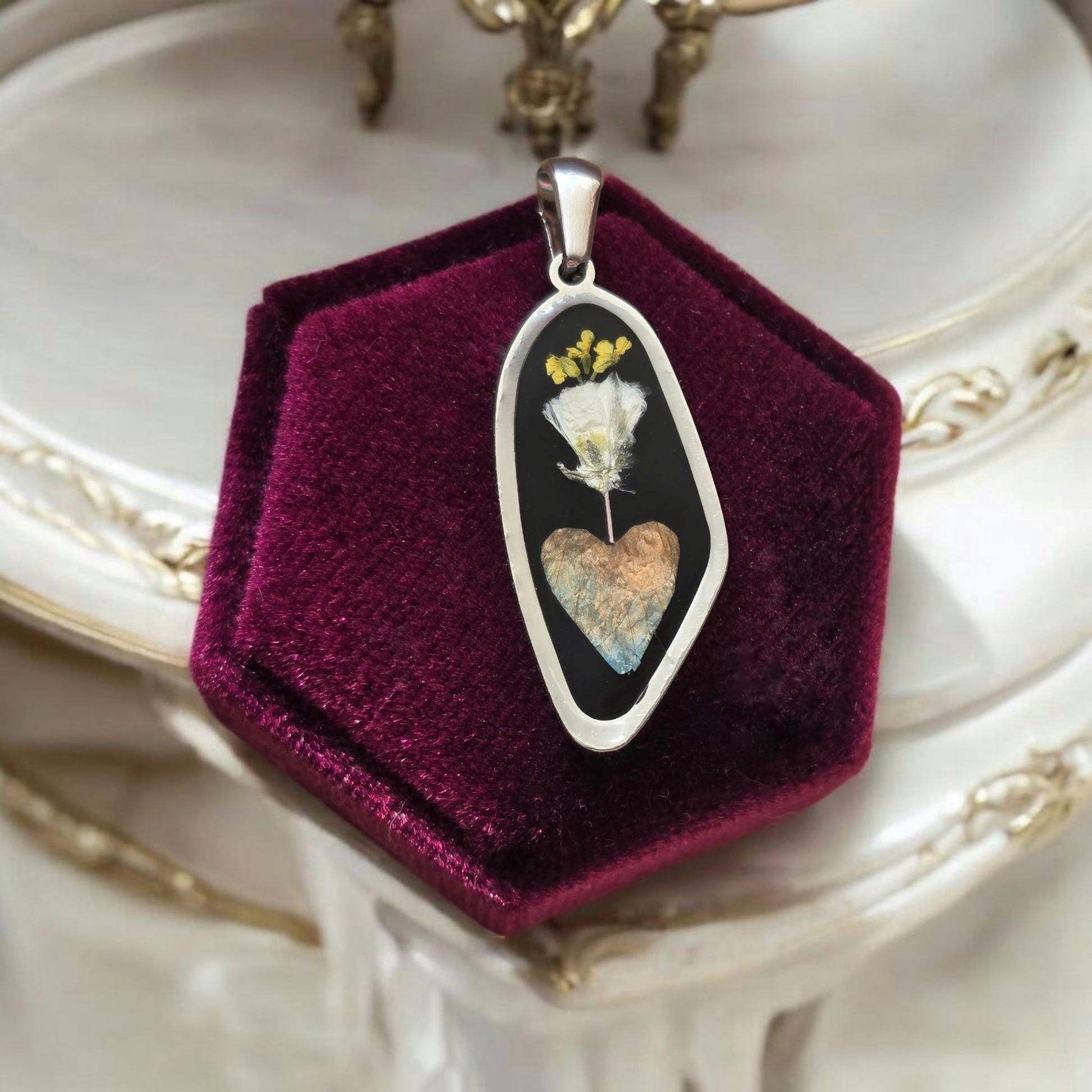 Ogni ciondolo custodisce veri petali essiccati, racchiusi in resina e incorniciati in acciaio inox 316L placcato oro 18kt. Nessun pezzo è identico a un altro: ogni cuore racchiude un fiore diverso, e ogni fiore racconta una storia irripetibile.