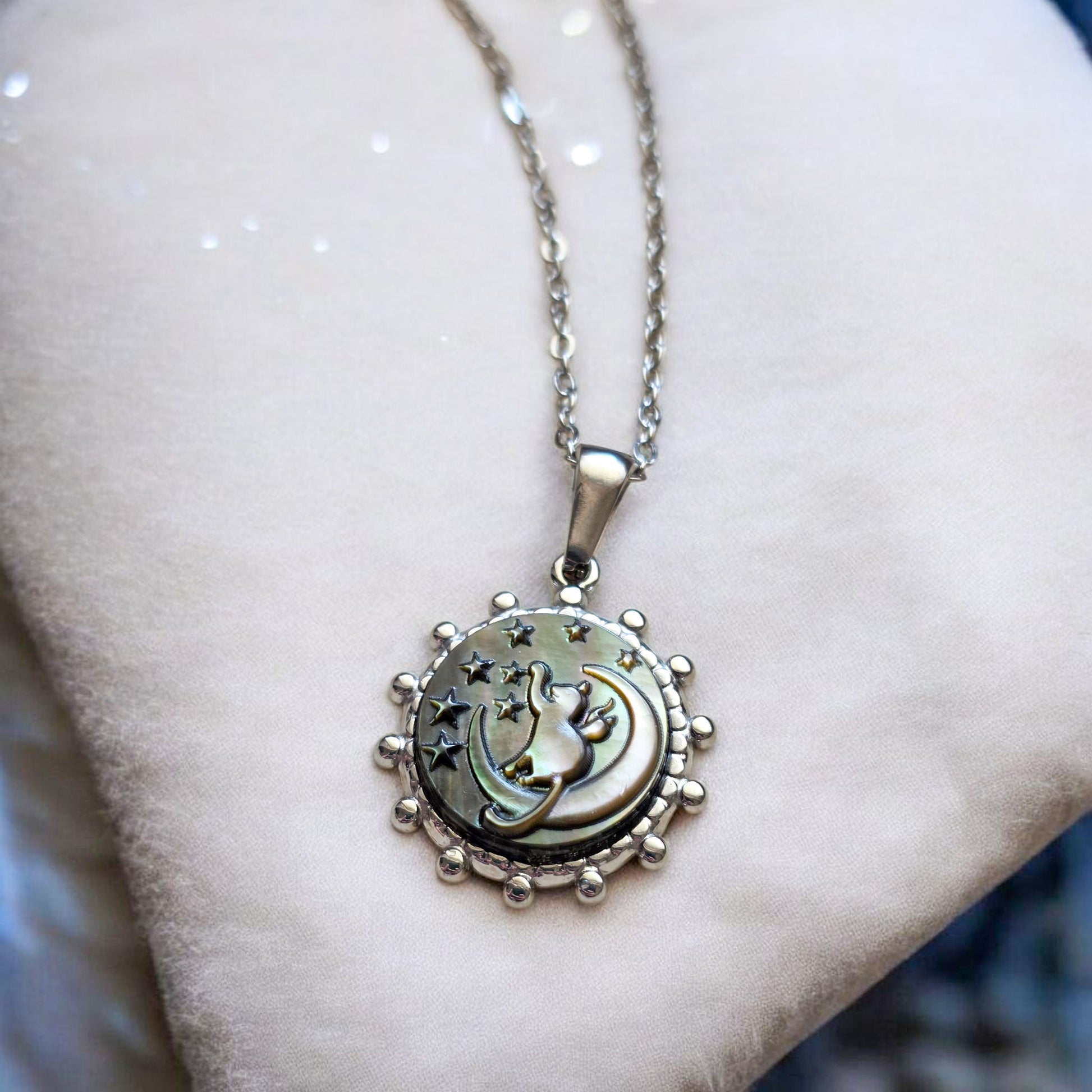 Il girocollo Cat Moon racchiude una scena incisa nella madreperla nera: un gatto che si arrampica sulla luna crescente, circondato da stelle. Un simbolo di curiosità, libertà e mistero, custodito da una cornice dorata che ne esalta i riflessi iridescenti.