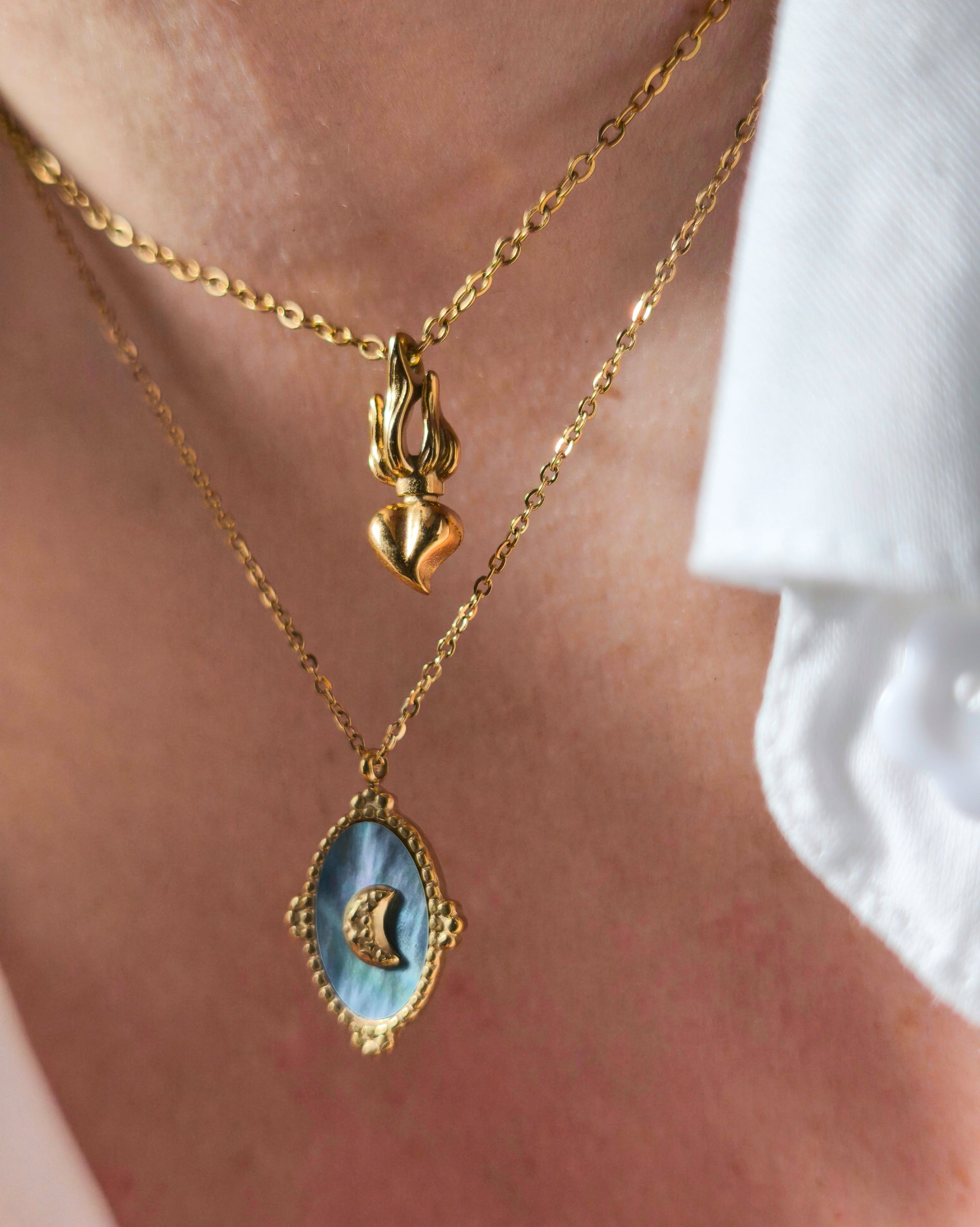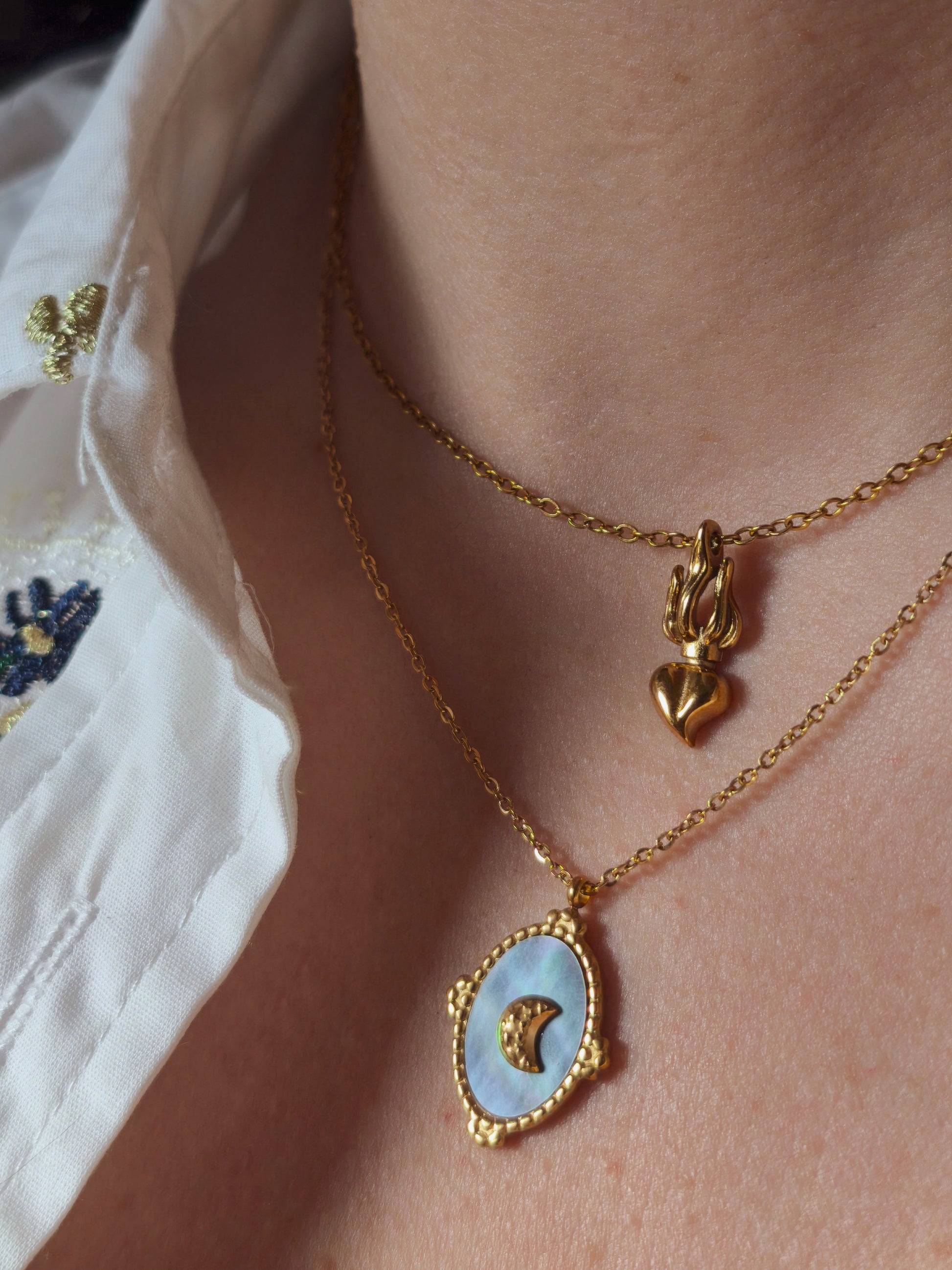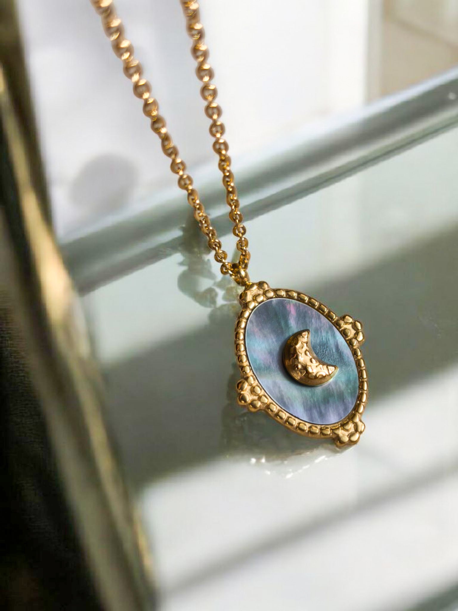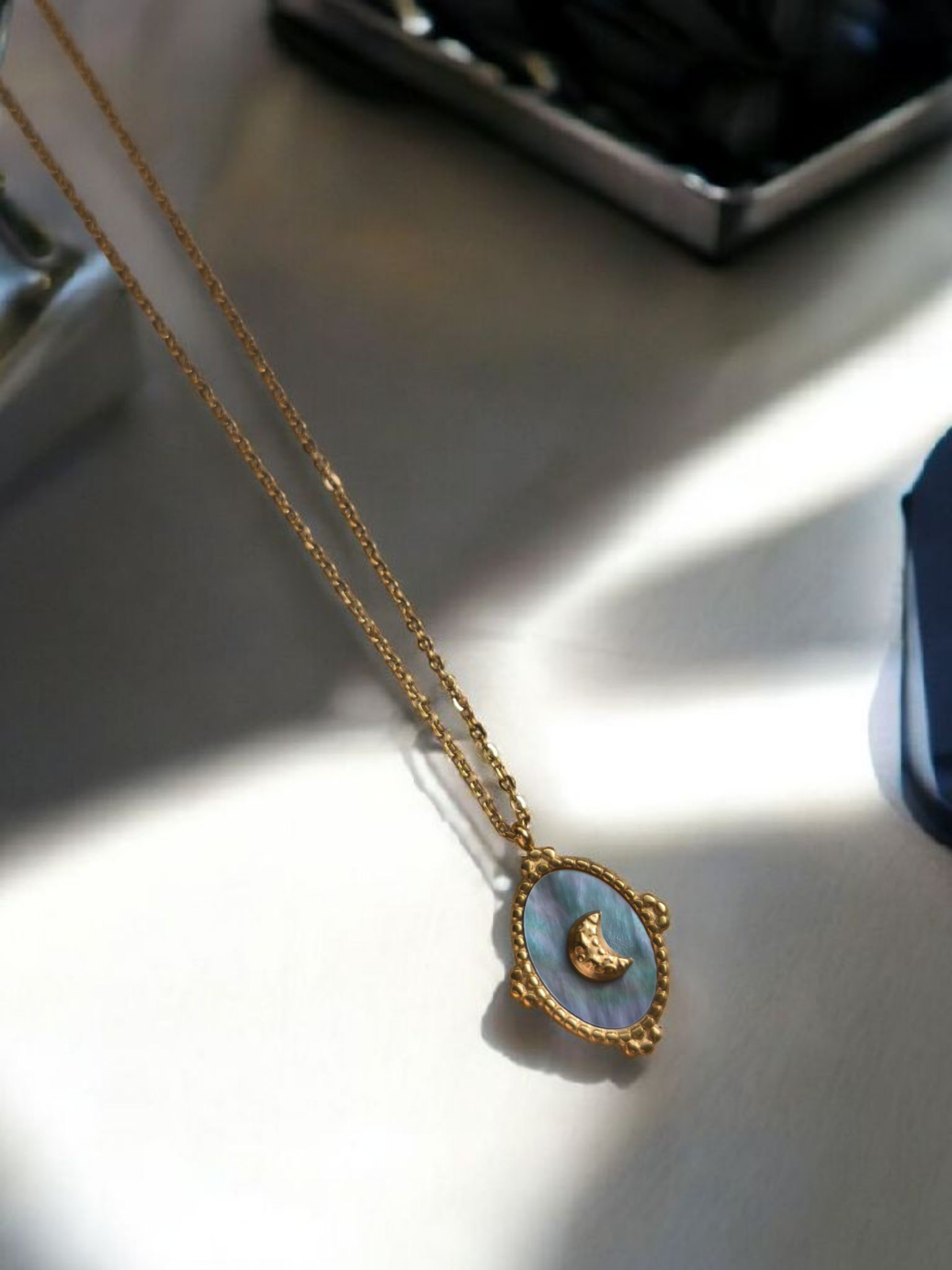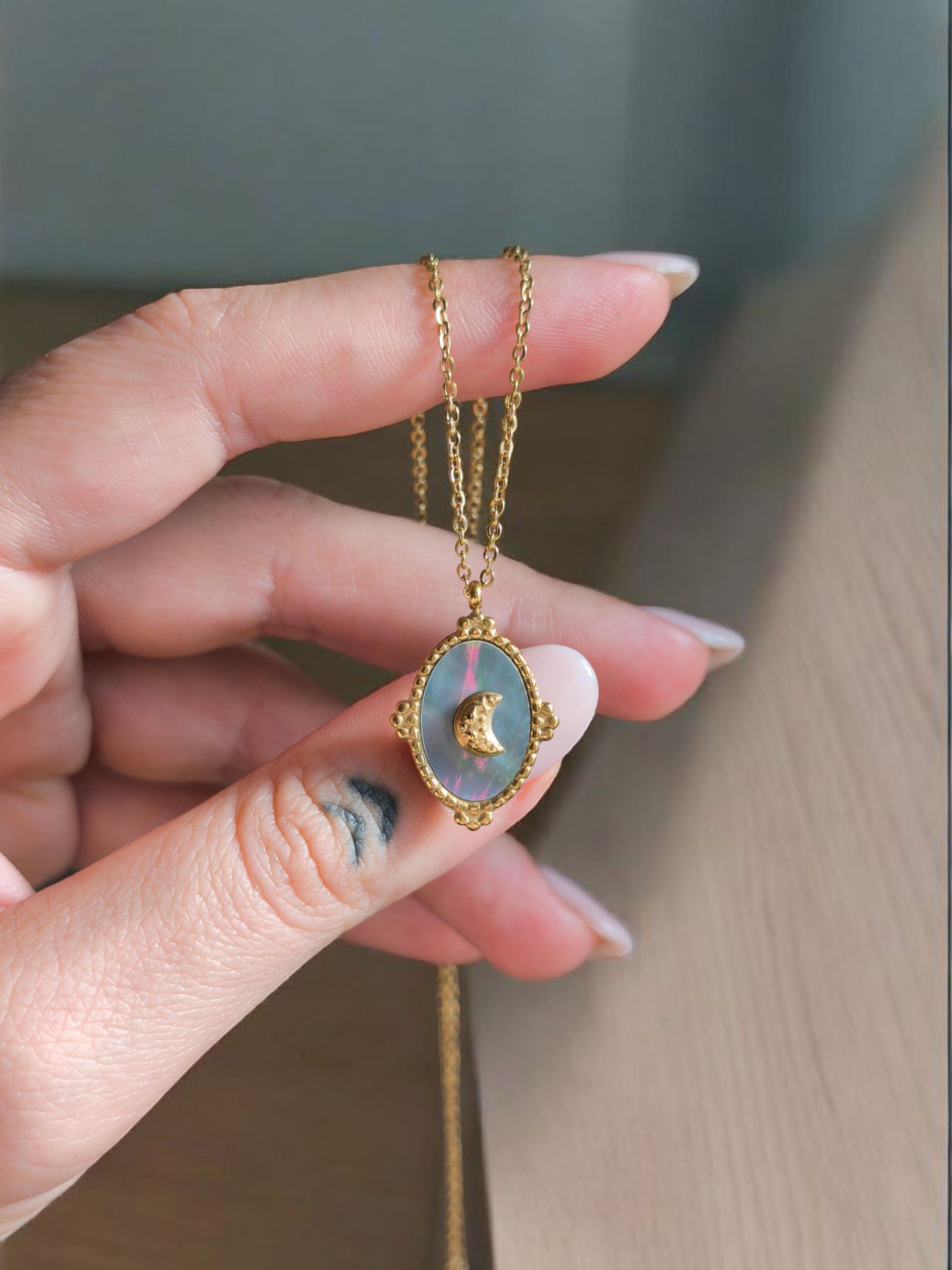 Una piccola medaglia ovale come una finestra sul cielo notturno, con un fondo in madreperla dalle sfumature cangianti e una luna crescente in rilievo dorato che sembra sospesa tra sogno e realtà.