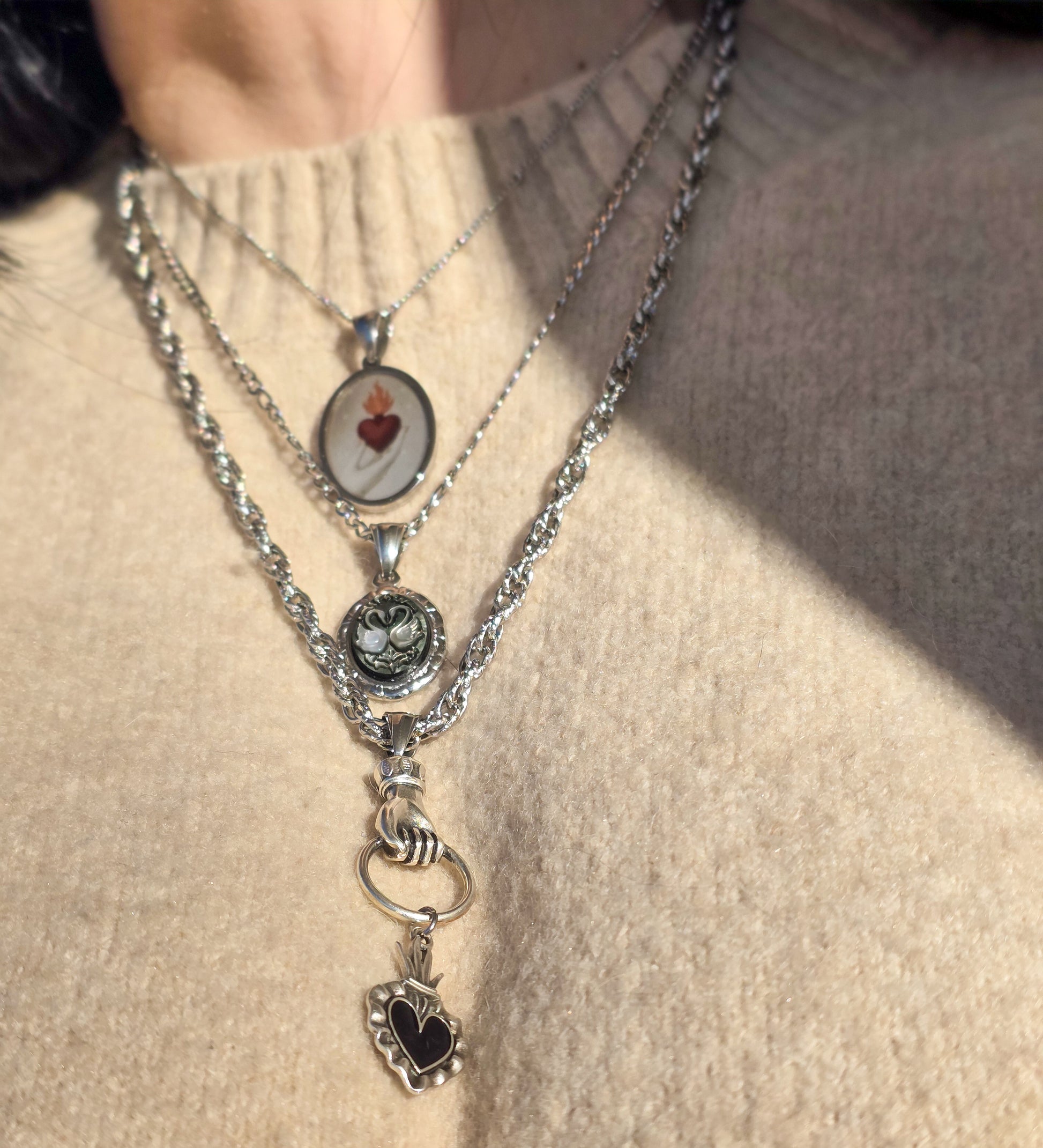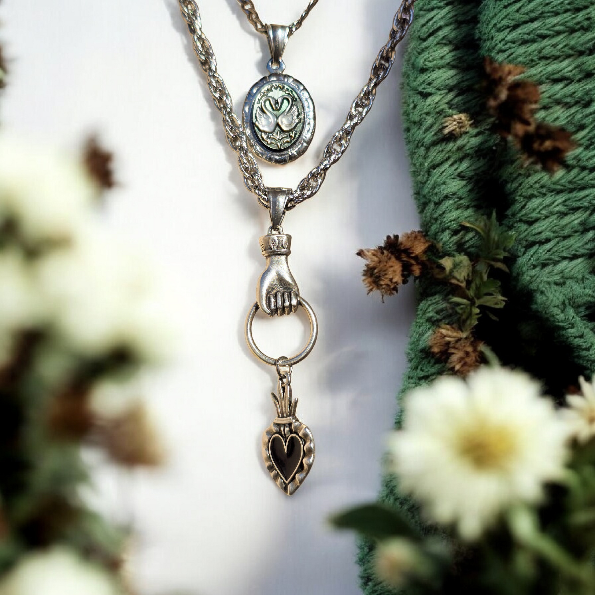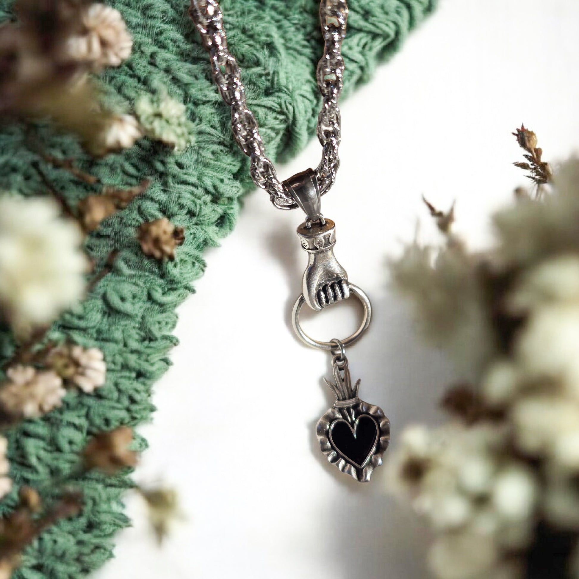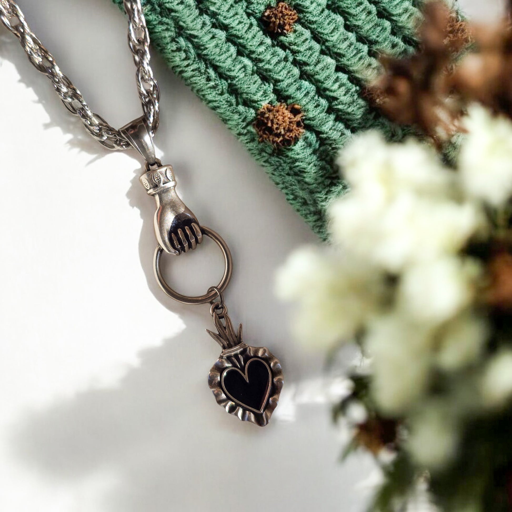 Una mano stringe un cerchio, gesto antico di fiducia e responsabilità, da cui pende un cuore sacro nero: profondo, silenzioso, essenziale.