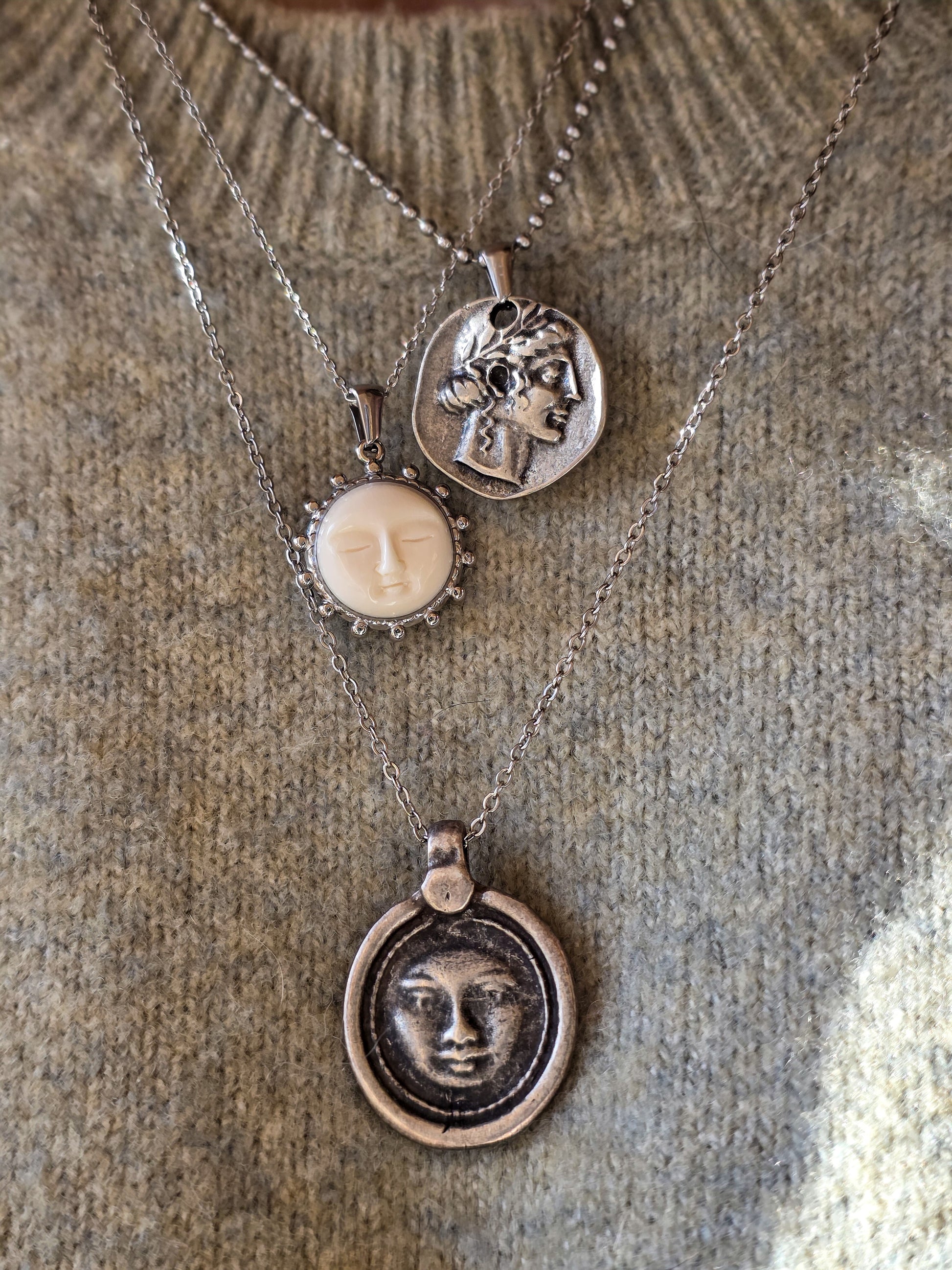 L’acciaio 316L garantisce durata e sicurezza anche a contatto con la pelle, mentre la placcatura in argento 925 dona al volto un aspetto luminoso e senza tempo, con una patina che ricorda i talismani antichi.